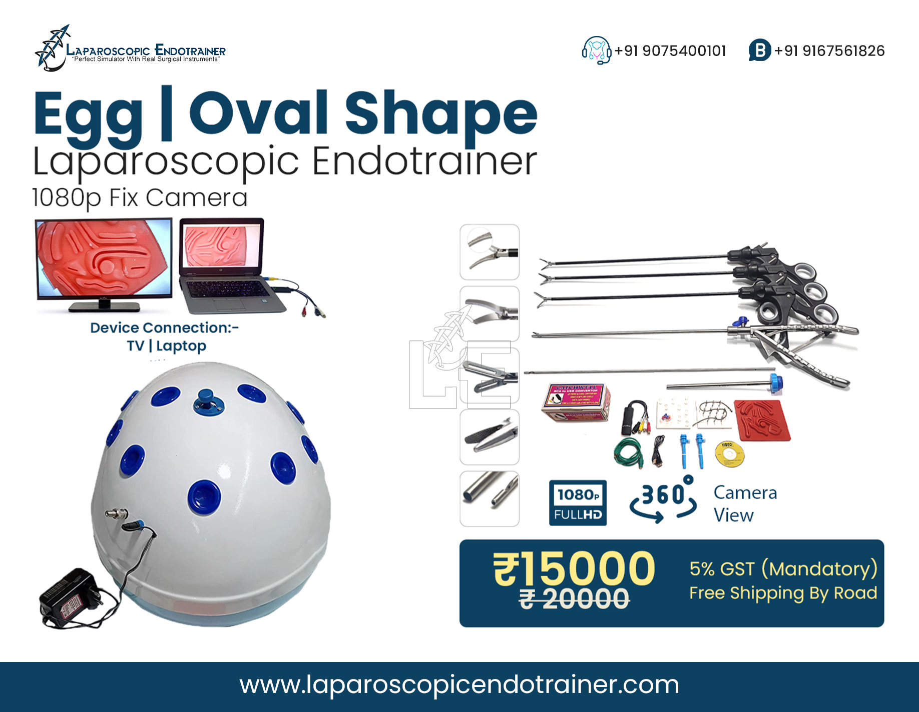 The Laparoscopic Virtual Video Endo Trainer Egg, Oval & Anda Shape - White Color Endotrainer Kit is a premium laparoscopic endotrainer designed for surgeons, medical colleges, hospitals, and skill labs in India. This CE certified laparoscopic endo trainer enhances hand-eye coordination, suturing, and real laparoscopic practice with 5 basic real surgical instruments: Laparoscopic Maryland Dissector, Bowel / Fenestrated Grasper, Curved Scissor, Ethicon Type Needle Holder Straight Jaw, and Knot Pusher with Reducer (5mm–3mm) — all reusable stainless steel instruments.