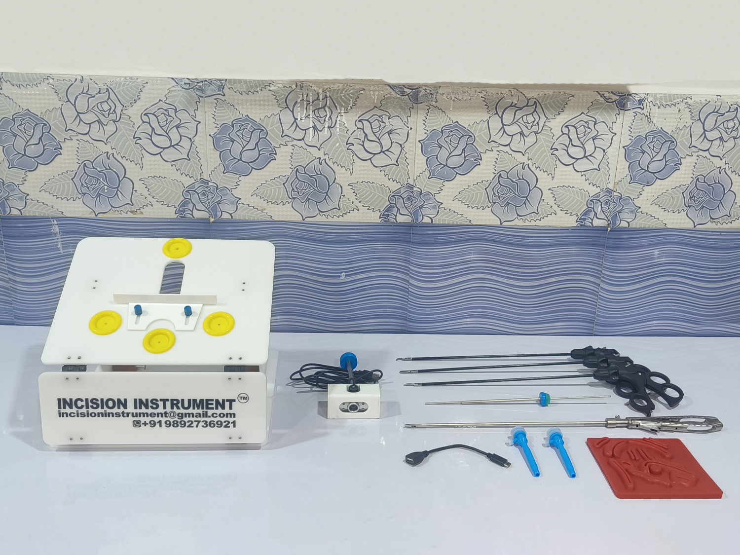 Crafted from high-quality acrylic, the trainer is lightweight yet durable. Practice modules include a silicone suturing pad and a thread passing & ball clamping module to develop depth perception, hand-eye coordination, and knot-tying accuracy. The kit includes 5 real reusable anti-rust stainless steel laparoscopic instruments (5mm × 330mm, autoclavable)—Maryland dissector, curved scissor, fenestrated forceps, Ethicon-type needle holder, and Bhandarkar knot pusher with reducer—providing true surgical feel.