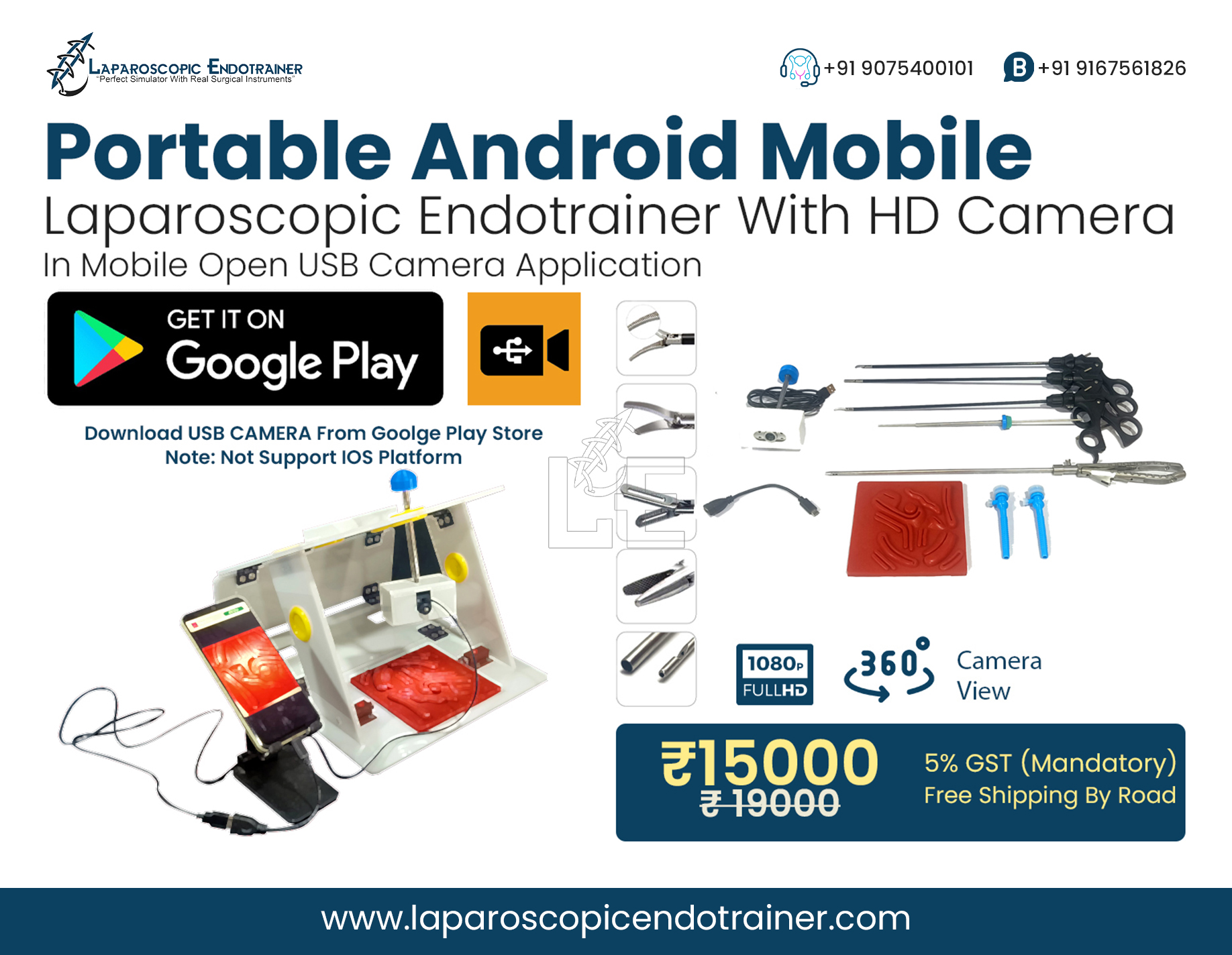 Laparoscopic Android Mobile Version Portable Endo Trainer Kit, built for flexible, real-world laparoscopic skills training using a mobile connection. This compact portable laparoscopic endotrainer features a detachable 1080p HD camera with 360° rotation and precise zoom-in/zoom-out control, delivering sharp visualization directly to your Android device via OTG.