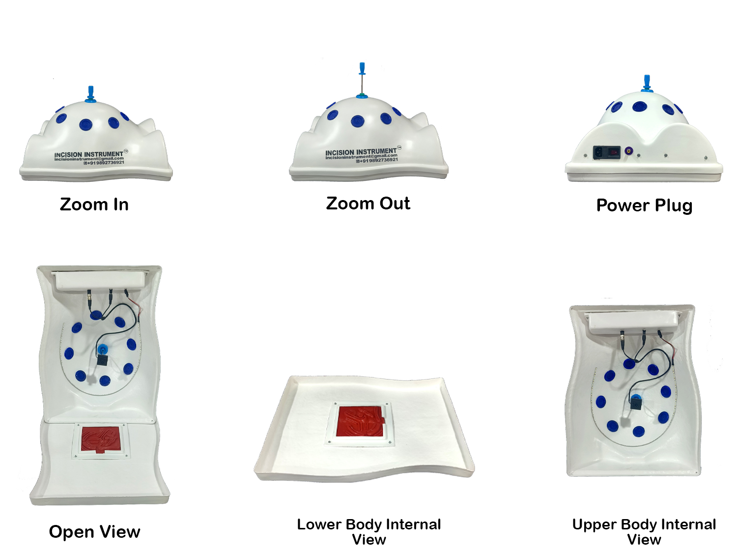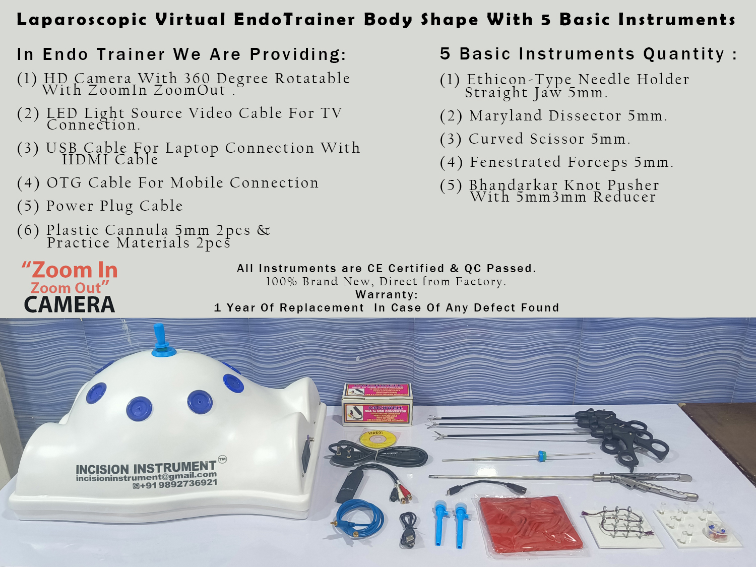 The Laparoscopic Virtual Video Endo Trainer Full Body Shape in white color is a professional laparoscopic training simulator designed for surgeons, residents, medical colleges, and skill labs in India. This CE Certified laparoscopic endotrainer kit helps improve hand-eye coordination, suturing skills, and real-time laparoscopic practice.